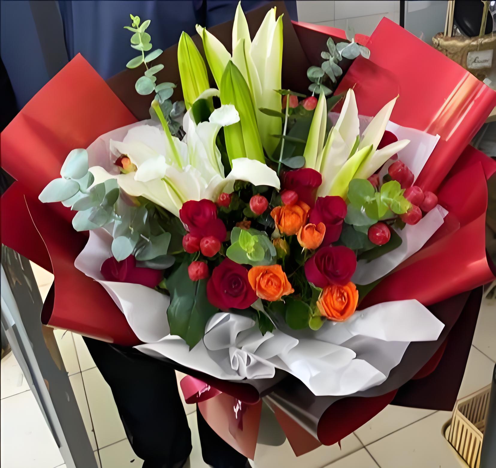 襄阳保康县花店包11枝红玫瑰、2枝多头白百合、6枝橙色多头玫瑰、红豆、尤加利叶